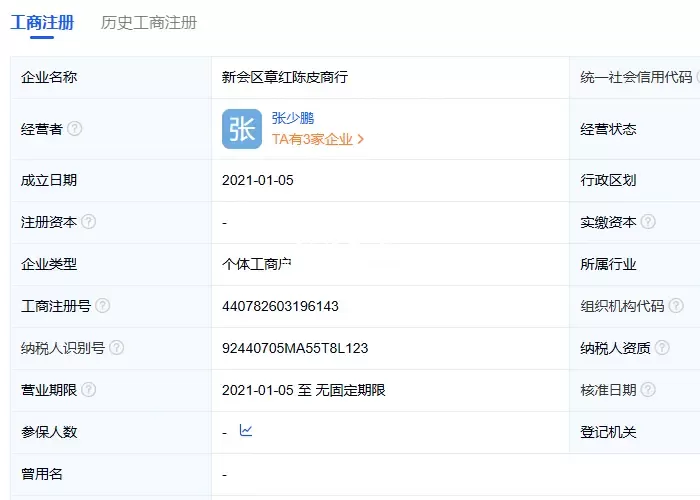 通查询了解到,小红家陈皮全名叫作“新会区章红记陈皮商行”,在天眼查可查询到其公司注册信息: